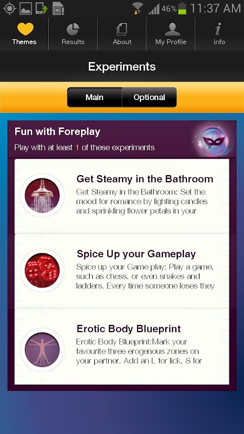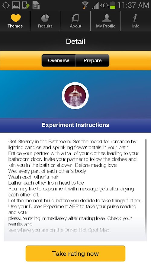 Welcome to The Durex Experiment: Discover Great Sex. Join thousands of lovers globally who are exploring what great sex means to them, emotionally and physically - and having lots of fun along the way! It unlocks and reveals a series of experiments for four weeks; kicking off with fun with foreplay, then heightening sensation, moving on to adventurous play and the grand finale. There are also mini tasks for those who want to keep discovering the kind of sex that moves you.