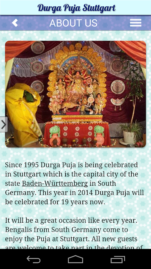 This Mobile Application gives you all information about Durga Puja celebration at Stuttgart, Germany