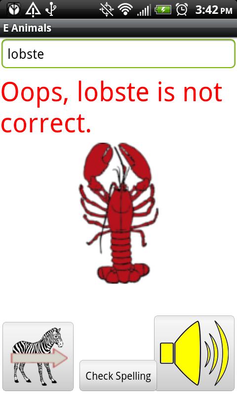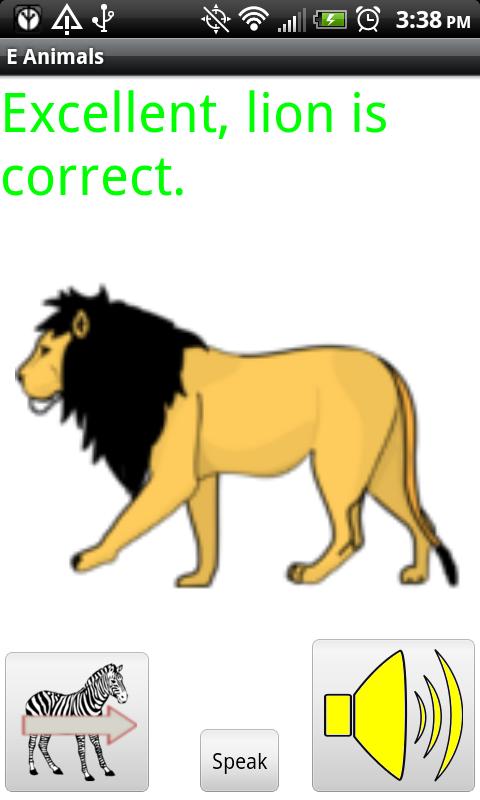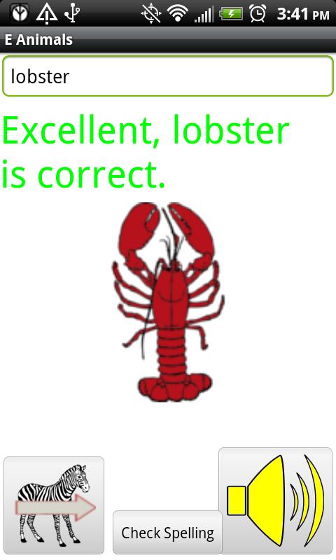 If you type the name of the animal, E Animals will check to see if you spelled it correct. Touch the speaker Icon to hear the correct pronunciation and see the correct spelling.