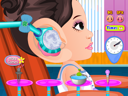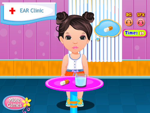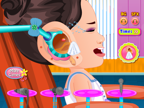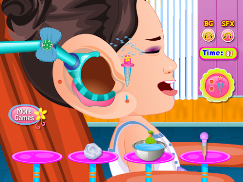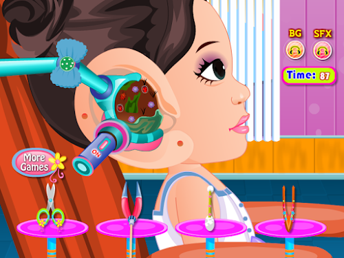 Rita spends his summer vacation alone in the house with her new toys received from her father. While playing with her toys, she noticed that one ear was bleeding pretty badly. She began to cry very loud and could not bear the pain so we decided to take her to a hospital as quickly to view a doctor. Once the adjustments to the hospital must enter the doctor's office and wait until it comes. We need to erase traces of blood near the ear and must apply a cream on a point that appeared on the ear. We need to cut your hair a tangle in your ear, and will extract all the germs on it he has to recover the ear. We'll put a device in your ear with which we can see the little ear Rita and we will be able to clean all the dirt and bacteria that we all have the ear that might cause pain. We need to squeeze red dots near the ear and still we will make you cream layer cake then we will inject a liquid into the ear. You need to give him a drug that will restrain the spread of bacteria from the ear and other problems. We invite you to choose and other games for girls so you can see if you're doing this kind of games.