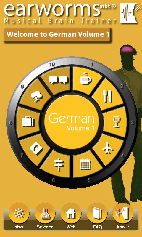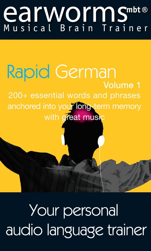 Learning German with earworms mbt® puts the words and phrases you need not just on the tip of your tongue, but also transports them deep into your long-term memory. Simply by listening to the rhythmic repetition of these specially composed melodies a few times the sound patterns become indelibly burned into your auditory cortex. Not only will you have successfully learned the phrase, but will also have the correct accent ringing in your ears!