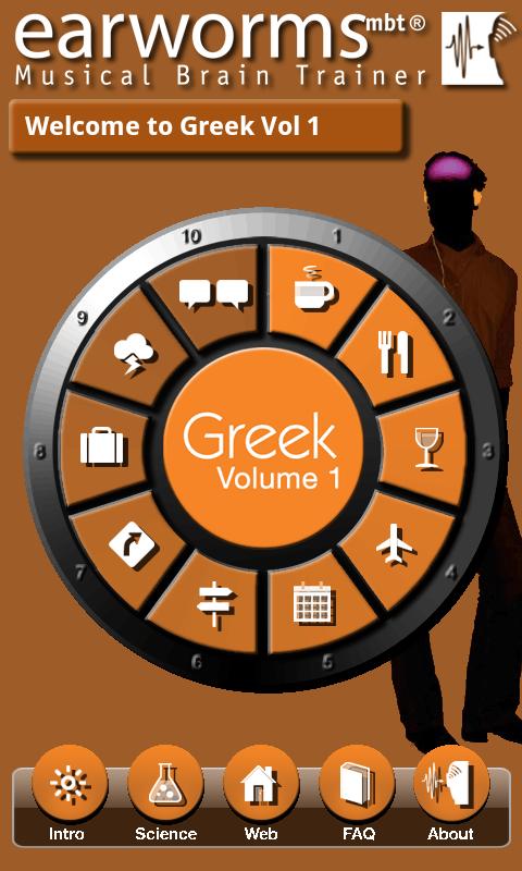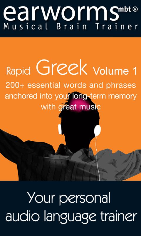 Learning Greek with earworms mbt® puts the words and phrases you need not just on the tip of your tongue, but also transports them deep into your long-term memory. Simply by listening to the rhythmic repetition of these specially composed melodies a few times the sound patterns become indelibly burned into your auditory cortex. Not only will you have successfully learned the phrase, but will also have the correct accent ringing in your ears!