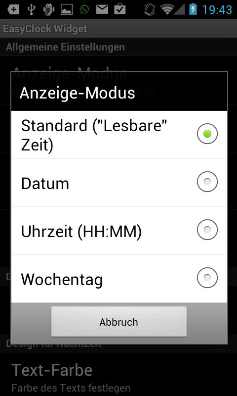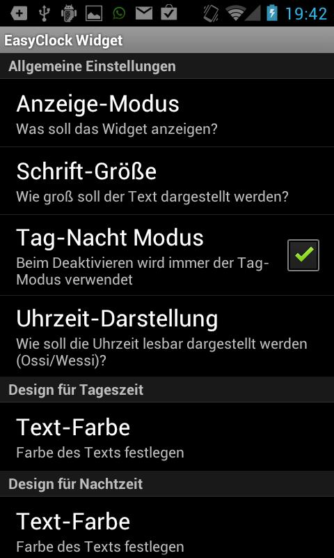 Die Schriftgröße sowie Farbe lassen sich für jedes Widget konfigurieren. Ein Tag-Nacht-Modus zum Wechsel der Text-Farbe kann verwendet werden.