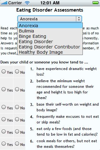 This app consists of common health assessments (surveys) for eating disorders, similar to those used by triage nurses to estimate health state.