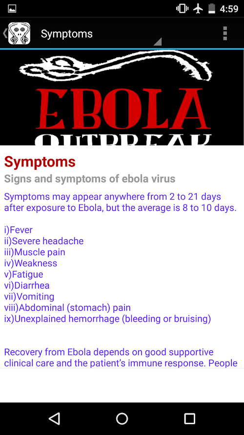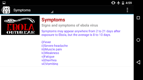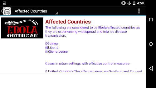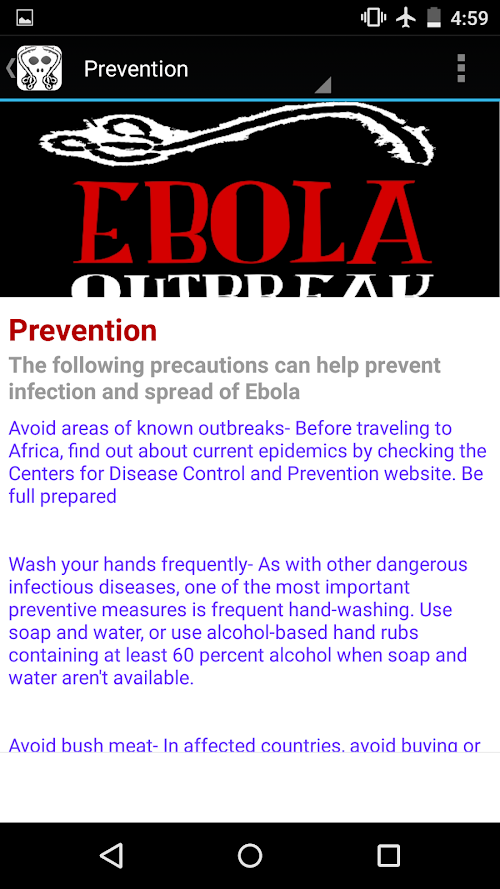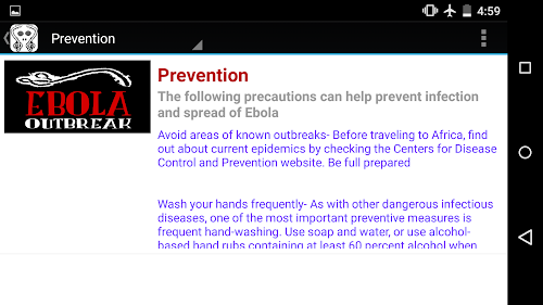 Ebola Prevention and Care is an app with information to prevent ebola virus and with measures one should take in case he/she is in an ebola infected area. Ebola Prevention and Care has information on symptoms that occur when someone has ebola, and it's prevention. Ebola Prevention and Care also has a list of affected countries with ebola and a section with brief history of ebola and it's outbreaks.