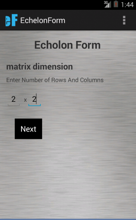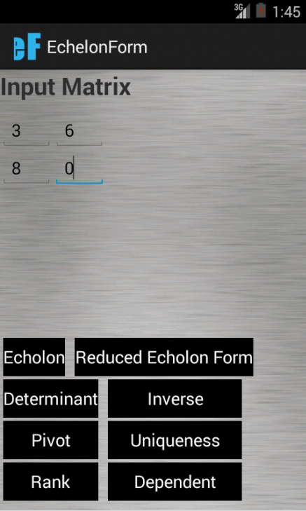 EcheForm is a app to calculate Echolon and Reduced Echolon form of the given matrices, it will also help in finding number of pivots, rank, Inverse and determinant of the given matrix.
