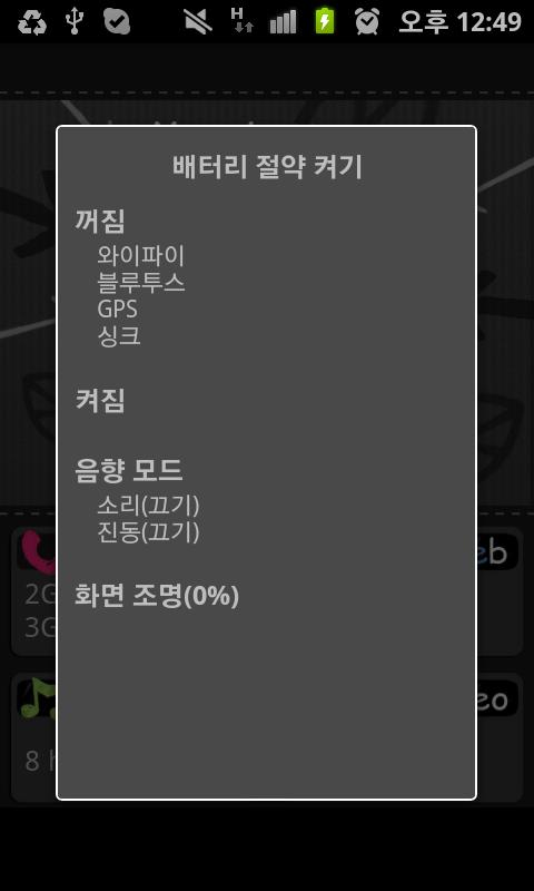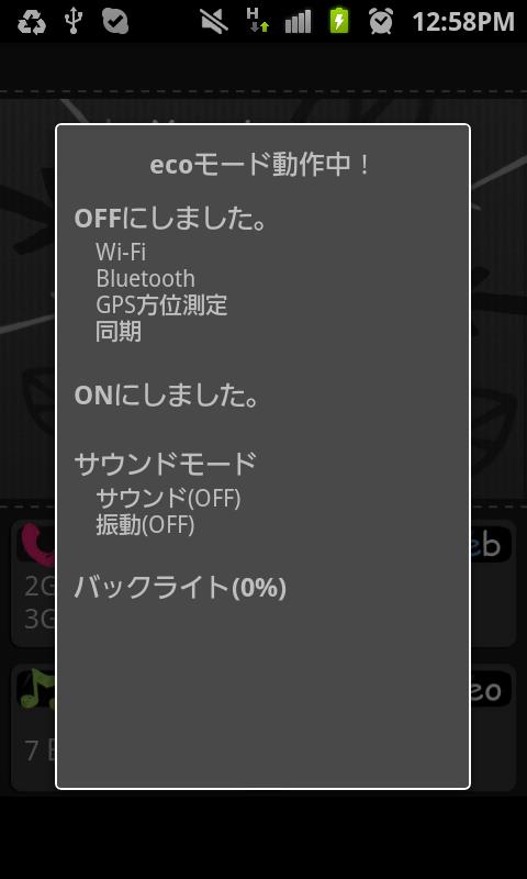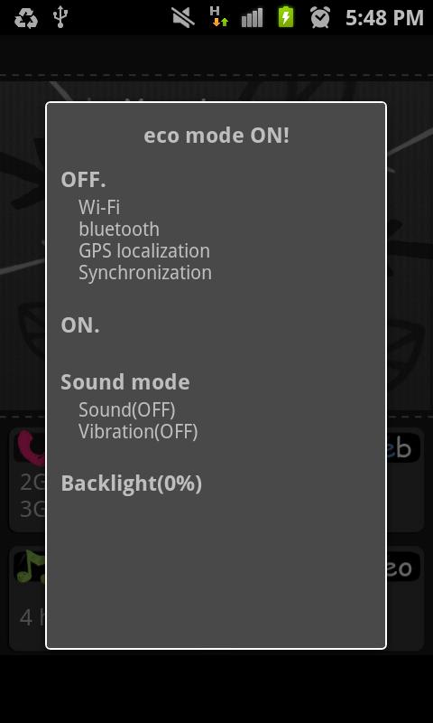 In eco mode, Wi-Fi, Bluetooth, GPS, backlight, sound mode, vibration mode and synchronization will all be OFF. This can easily reduce battery consumption. (You can customize your own OFF menu!)