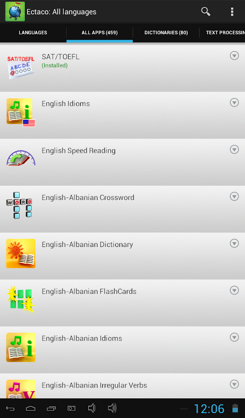 This catalog encompasses over 800 apps for dozens of languages we have developed for translation purposes, language studies, speed-reading courses, and games. It includes Dictionaries, Phrasebooks, Idioms, Irregular Verbs, SpeedReading course, Crosswords, FlashCards, illustrated Dictionaries and Language Teachers, U-Learn courses, Text Translators, Vocabulary Builders, PhotoText input method to extract texts from pictures, application Suites, and SAT preparation courses.