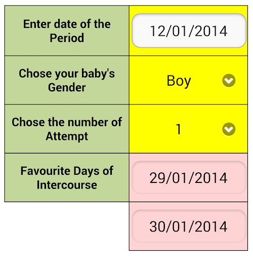 The method determines the specific days of fertilization by girl and certain days for fertilization by boys from start date of the period according to the following table: