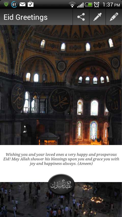 Share Eid cards via EMAIL, SMS, FACEBOOK, TWITTER and WHATSAPP - Choose from a collection of breathtaking images, greetings and Quranic verses.