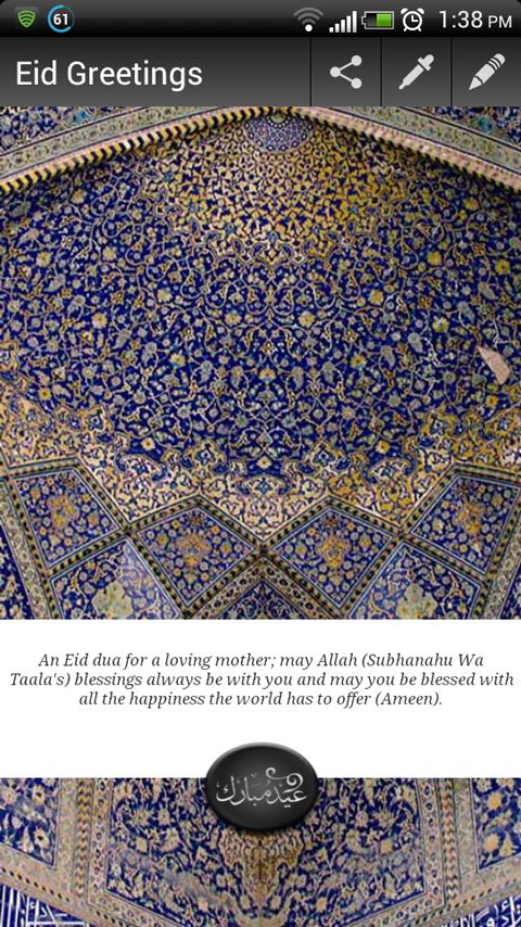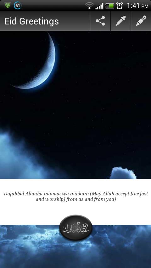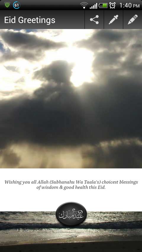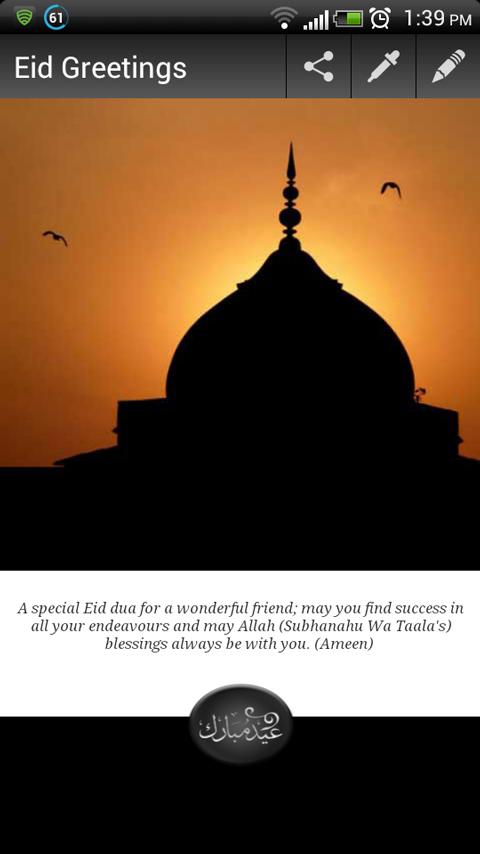 Share Eid cards via EMAIL, SMS, FACEBOOK, TWITTER and WHATSAPP - Choose from a collection of breathtaking images, greetings and Quranic verses.