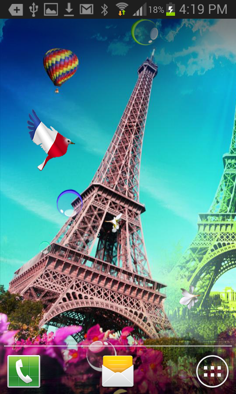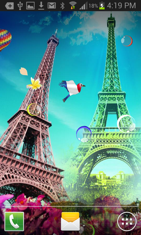 This is a beautiful high quality playable animated live wallpaper of Eiffel Tower, Paris, France. You can play with the realistic looking falling bubbles and leaves in this wallpaper, just touch them on the screen and transform them into flying birds of French Flag. It features Eiffel Tower of Paris, Bubbles, Leaves and Birds.
