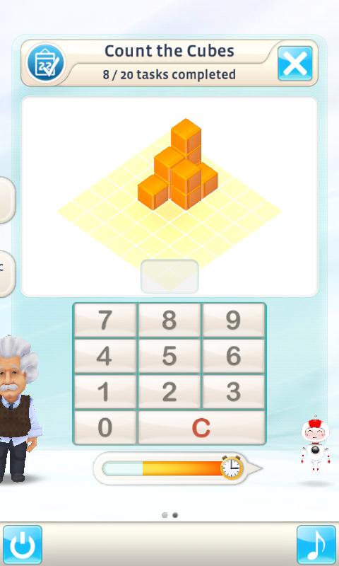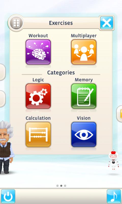 Albert Einstein and his cute little assistant Robo will support you in any aspect of the game. They will be at your side whenever you need them, explaining the different exercises and illustrating the scientific background of each exercise. They will motivate you to keep moving and to care about your mental fitness.
