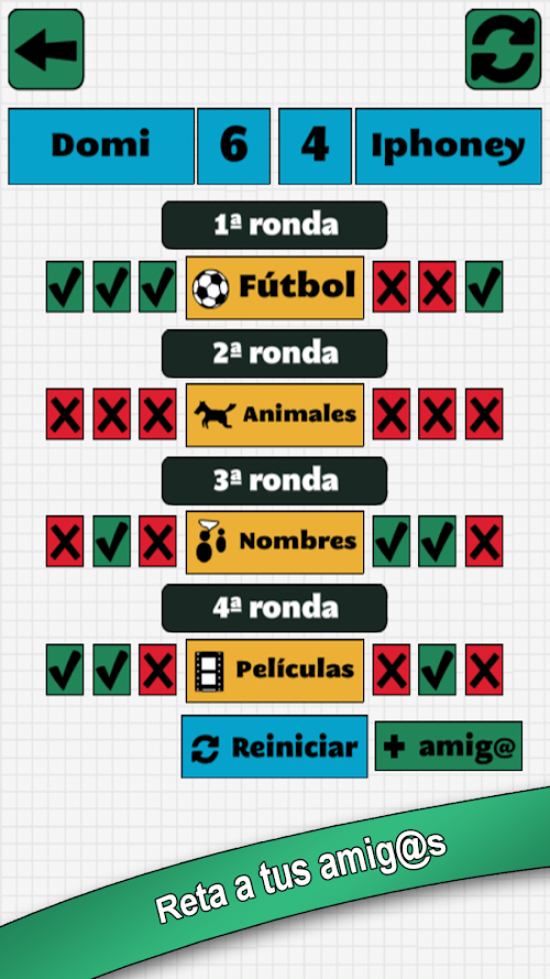 Se juegan 4 rondas. En cada turno, tu oponente y tu recibiréis las mismas tres palabras para que las adivinéis.