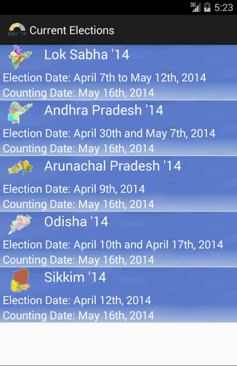 Elect’14 version 3.0.0 includes the information about upcoming 16th Lok Sabha, Andhra Pradesh assembly, Odisha assembly, Arunachal Pradesh assembly and Sikkkim assembly elections and the real time results will be displayed on the counting day of May 16th 2014. Previous version of our app was the assembly election related data of Chhattisgarh, Madhya Pradesh, Mizoram, Rajasthan, Delhi, Karnataka, Meghalaya, Nagaland and Tripura.