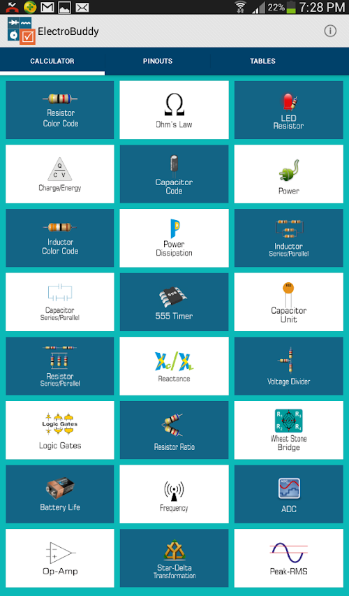 It has three main categories namely Calculators, Pinouts and Tables.