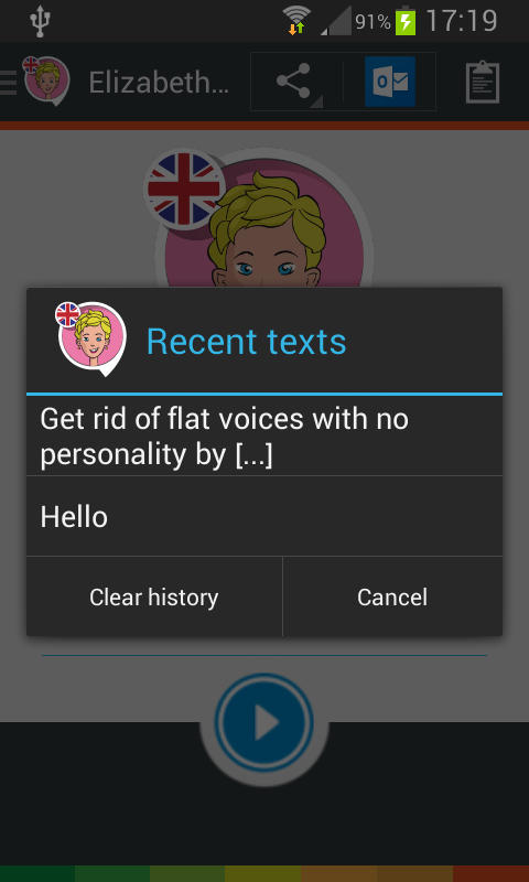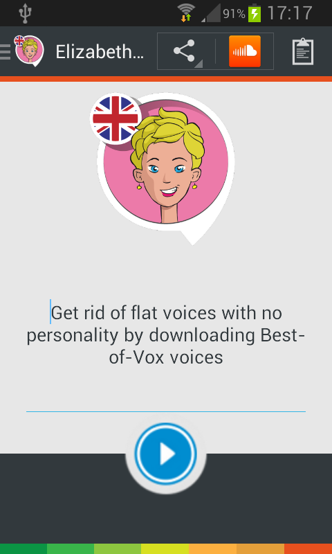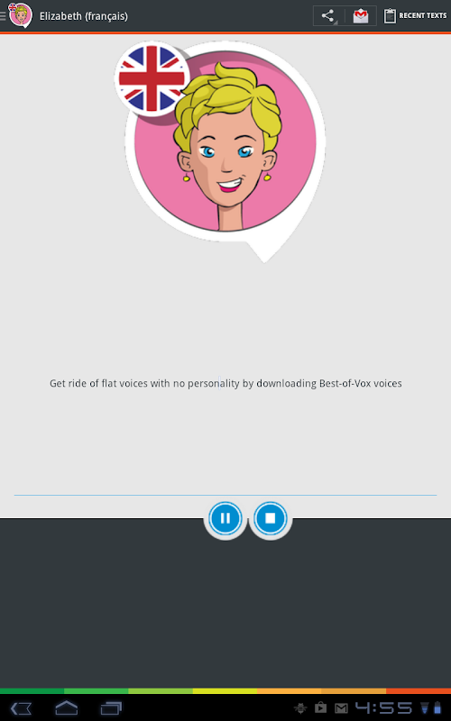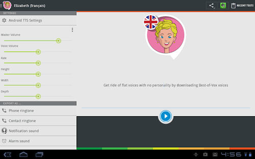 The Best-of-Vox application allows you to type or paste text and to have it read out aloud by the voice that you have chosen. You can then save it as a ringtone or share it with your friends on SoundCloud !
