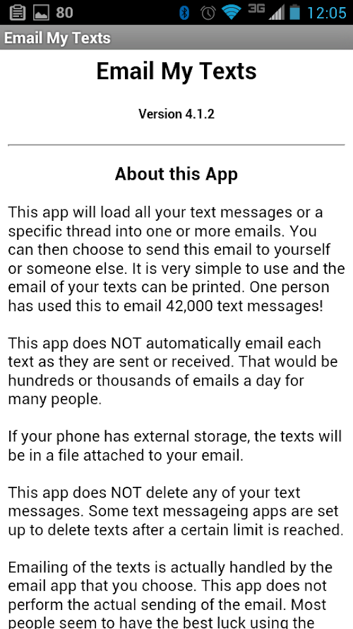 Some apps that email each text, require you to enter your email address and password. That is a security risk. Do not give out your password to anyone! This app does NOT require you to enter your email address and password, so your privacy is maintained. This app does not automatically email each text as they are received. That would be hundreds or thousands of emails a day for many people.