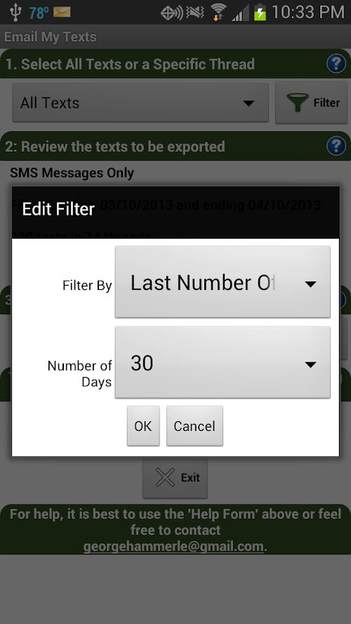 Using this app is a great way to save off texts or create a copy in case you need them for a legal proceeding. Many people need their texts for court cases. And after they are emailed to you, you can print them out and present them in court. Or use this app to get a copy of the texts from someone that is harassing or threatening you.