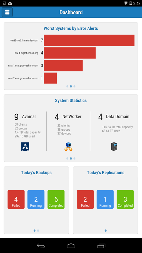 Backup & Recovery Mobile provides mobile monitoring and alerting for your EMC NetWorker, Avamar and Data Domain systems. It tracks critical data protection processes such as backup,replications, and storage capacity from anywhere. BRM mobile provides instant access to all events and alerts generated across all supported DPAD products. In addition, you can now take actions such as acknowledging alerts, sending emails on backup details, and starting, or restarting failed backups, or stopping running backups for both NetWorker and Avamar.