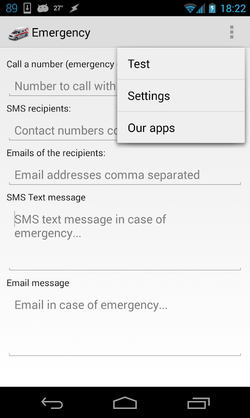 Improve your own safety by installing our emergency alert button and let everybody know you are in trouble by letting the app send a short alert notification to your friends or family via email or SMS/text message and calling a number with a simple push of the power or soft widget button.