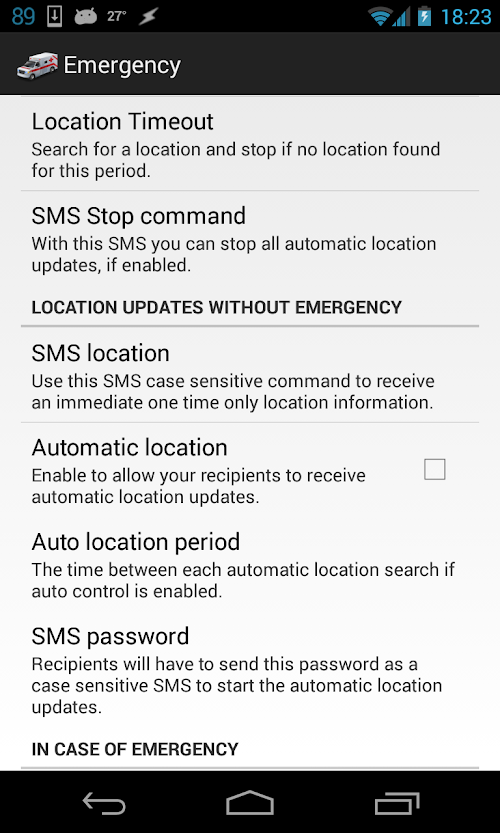 ✔ Set up a trusted list numbers and everybody in that list (or everybody knowing the SMS command if you choose to do so) can send SMS commands to the phone if they suspect that something wrong is happening to you, even if no emergency has been triggered.