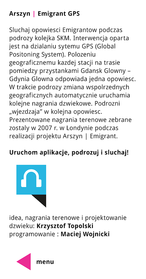 When traveling coordinates changes automatically launching a new sound recordings. Travelers 'enter' into another story. Presented field recordings were collected in 2007 in London, England during the project Arszyn | Emigrant.
