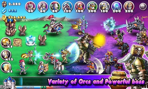 4. Wide variety of combat arms, such as footman, spearman, knight and archer, and each has their own skills and characteristics which can be upgraded. Correspondingly, the enemy also has variety of orcs, tigerish, strong, rapid and almost indestructible powerful boss. The key to victory is the good co-ordination.