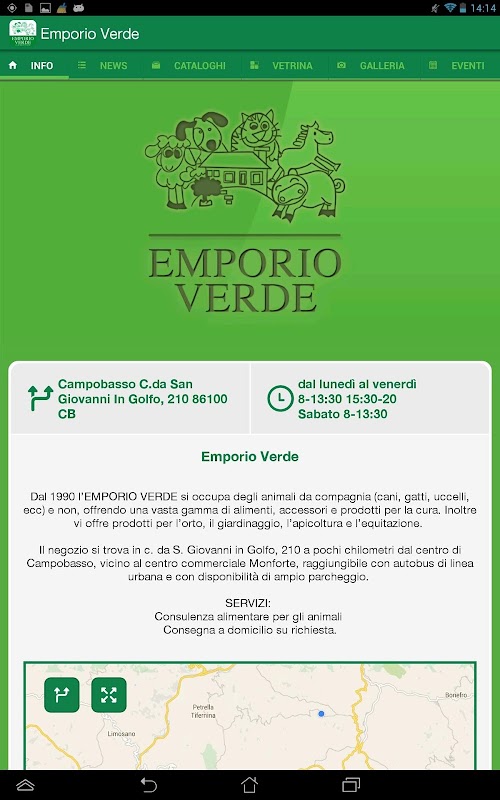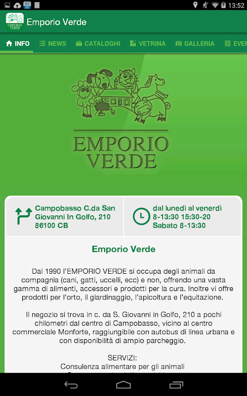 Consegna a domicilio su richiesta.Since 1990, EMPORIO GREEN takes care of pets (dogs, cats, birds, etc) and not by offering a wide range of foods, accessories and care products. Also offers products for the garden, gardening, beekeeping and horse riding.