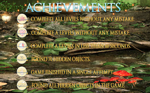 With 6 Beautiful Hand Crafted Levels with Hidden Objects, Hidden Pictures for you to discover which allow you to Unlock 6 fun and challenging Achievements.