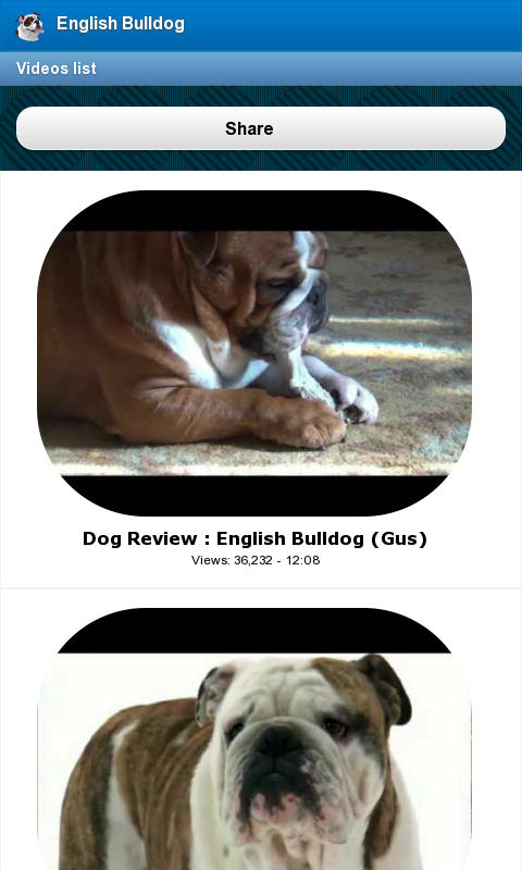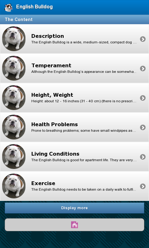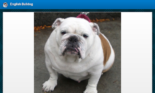 English Bulldog Dogs, app for Android. If you own a Bulldog, or you want to buy a dog soon, this application is for you. Are you a dob breeds fan? Have all the info about your dog breed in your mobile phone or tablet. Includes dozens of dog pictures and photos, information about your dog, training exercises and more. Detailed contents: