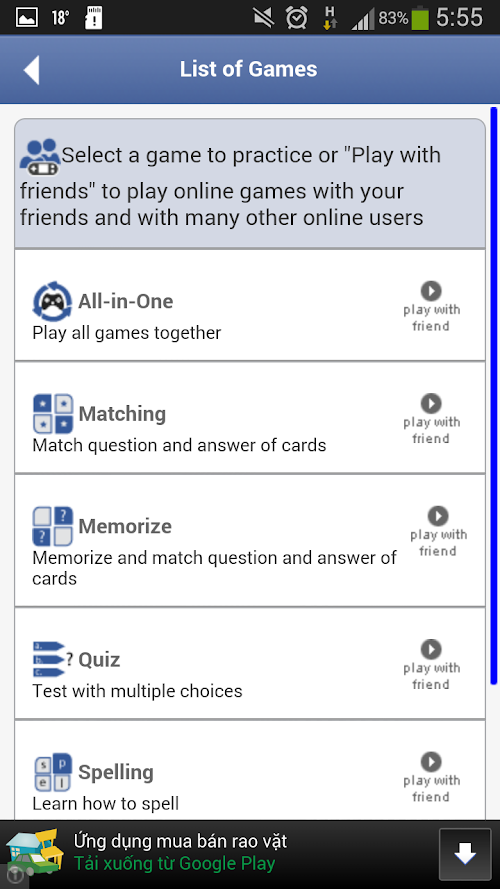 2. Support all-in-one game (a game including quiz, matching, memorize, spelling, ...)