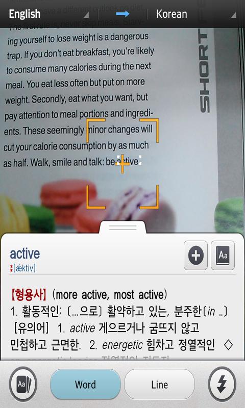 - Provides a translation immediately when the camera is aimed to the chosen word