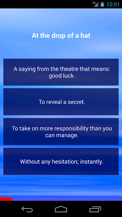 Test yourself and find out if you know the meaning of common English idioms such as "hit the sack", "at the drop of a hat" and "let the cat out of the bag".