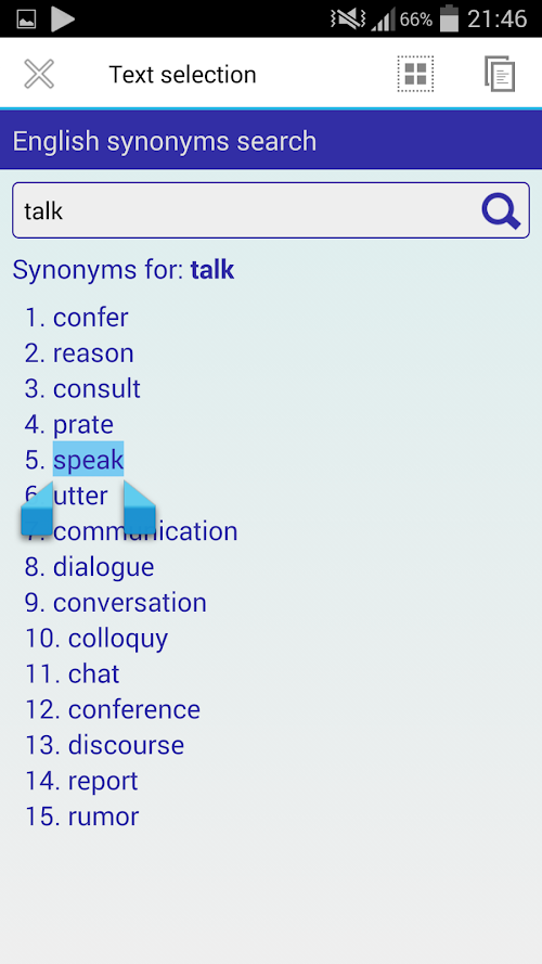 Simple and functional English synonyms dictionary. The database of words is huge. You just type a word, press a button and a lot of synonyms are going to be displayed. You can then select them and copy them to another app or wherever you want.