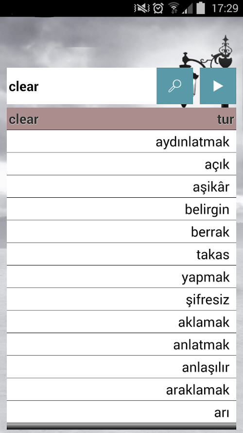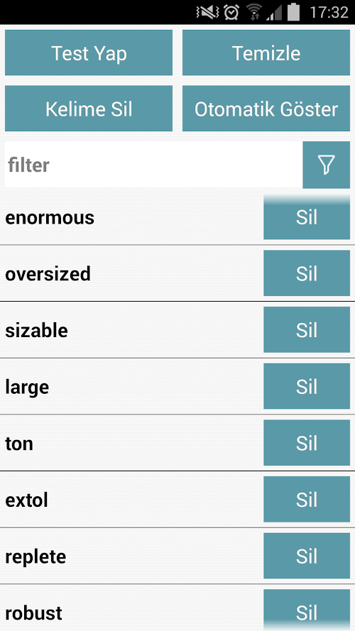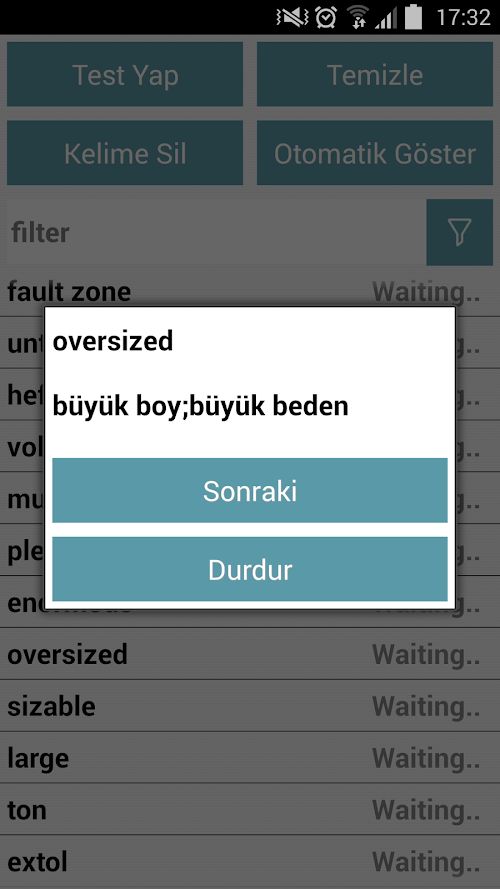 Also, it has dictionary functionality. You can search any word in Turkish or English. These searched words are put on word list, so you can see these words later and make test with them.