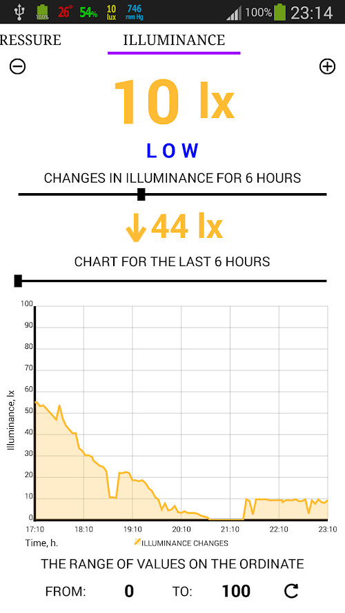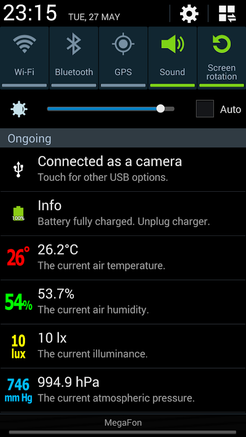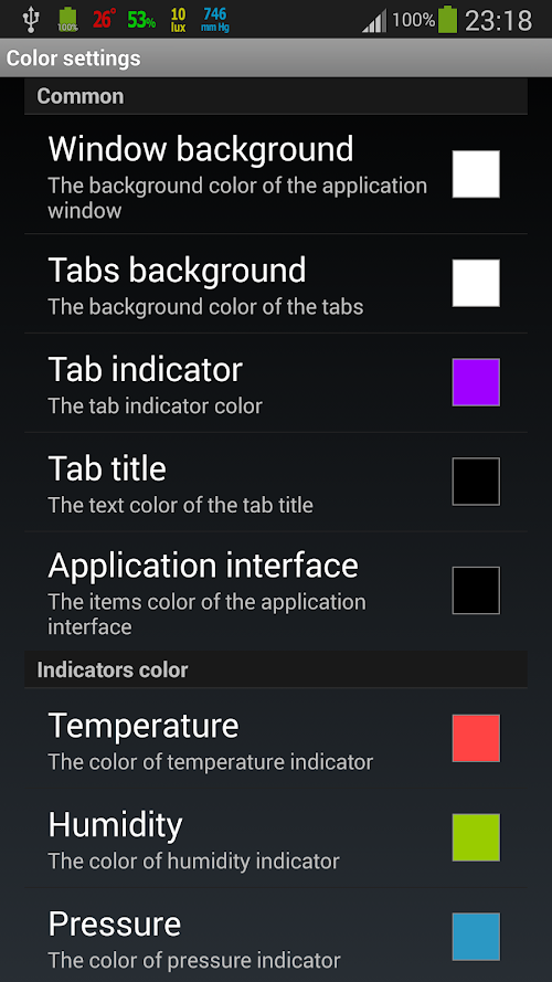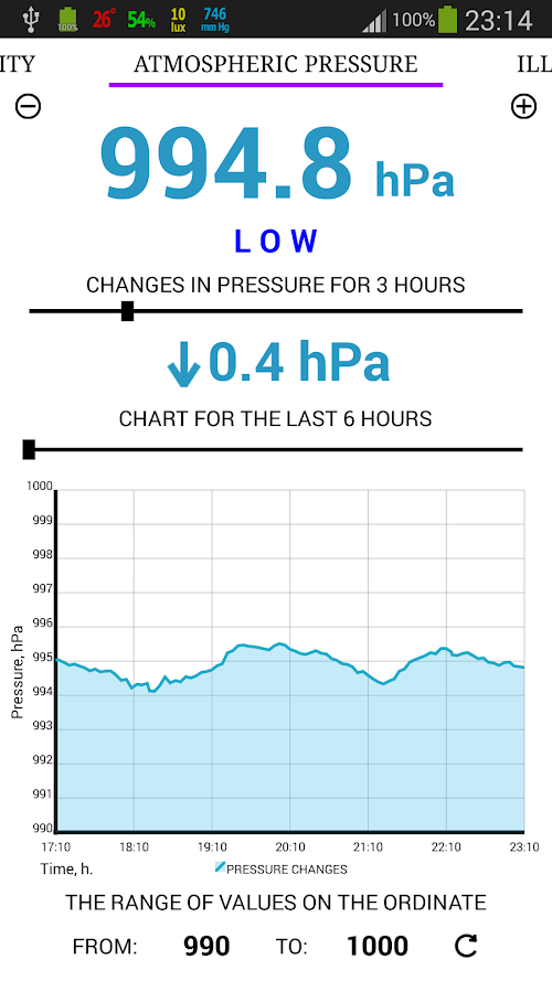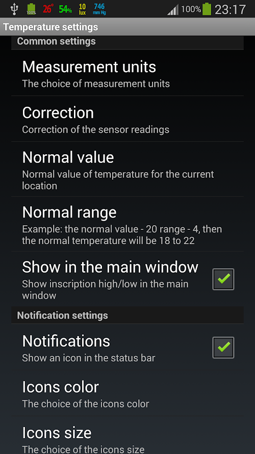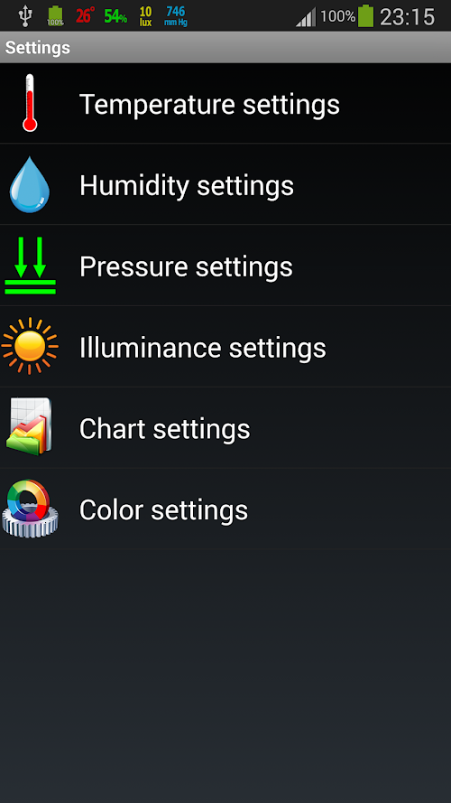 Environment sensors - application combining thermometer, hygrometer, barometer and light meter. Allows you to measure the temperature and humidity of the ambient air, atmospheric pressure, as well as the level of illumination. Works on devices equipped with appropriate sensors (Samsung Galaxy S4, Samsung Galaxy Note 3).
