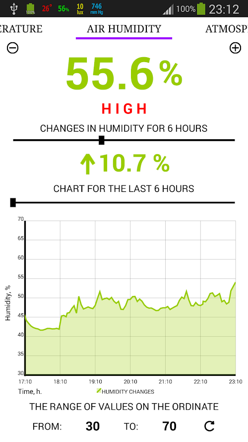 The application window contains four tabs: air temperature, air humidity, atmospheric pressure and illuminance. Navigation between tabs by using horizontal scrolling. The program displays the current sensors readings, readings dynamics (growth /decline) and a chart for a certain period of time.