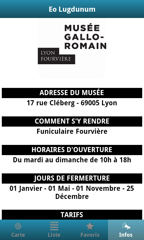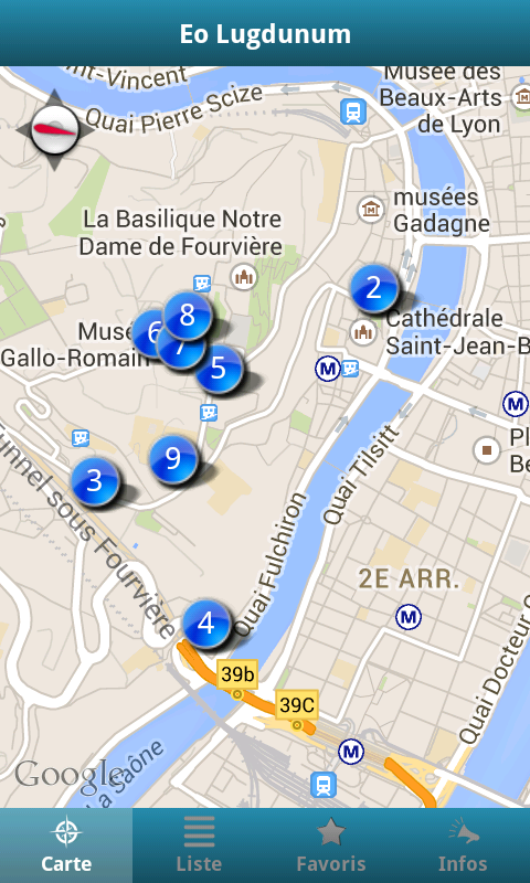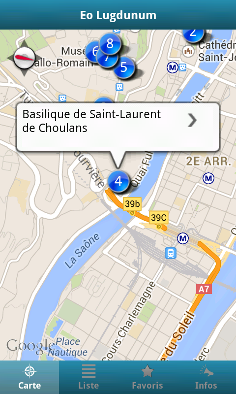 The Romans founded Lugdunum in 43 BC and since then, Lyon has never ceased to exist. Over time, the city center is moved from one place to another. Originally, he was the Fourvière hill, the site of the foundation. This application will help you discover the archaeological sites preserved on the hill and along the Saone, in the heart of the area classified as World Heritage by UNESCO. Guided by the GPS of your device, you can access the older buildings, theaters and Roman baths, the beginning of our era. You will also visit the remains of several buildings of the early Christian era, between the 4th and 7th century baptistery, near the Saint-Jean cathedral churches and sites of Saint-Just and Saint-Laurent Choulans.