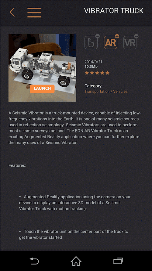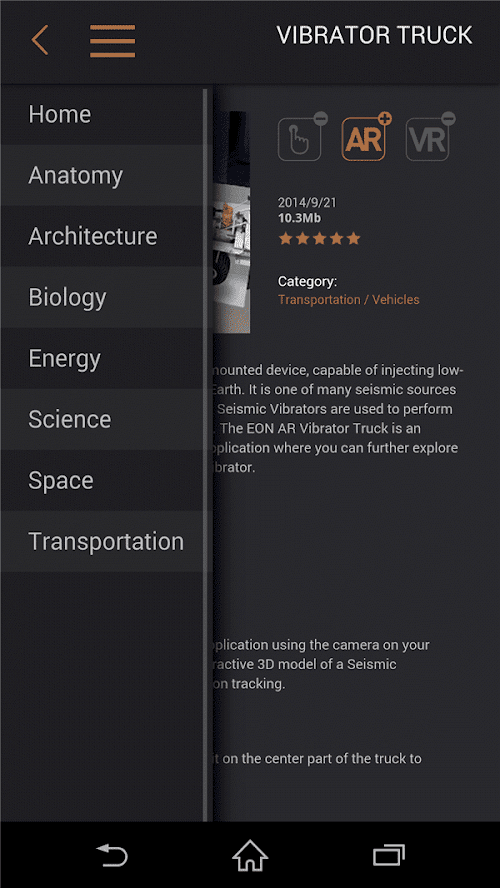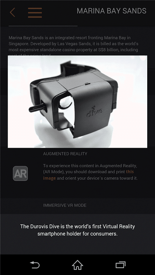 The Augmented Reality application uses your device’s camera to display interactive 3D models with motion tracking. To experience this content in Augmented Reality, (AR Mode), download and print the Tracker Image Marker from the Google Play Store listing and orient your device's camera toward it. The Tracker Image Marker works best when flat on a table. You can also download marker here: http://goo.gl/oLgJGj