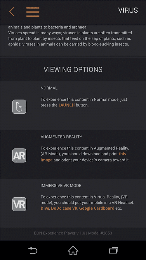 EON Experience VR is a service for viewing interactive Augmented Reality and Virtual Reality applications on your phone. The EON Experience VR application delivers an exceptional AR/VR experience anywhere, anytime.