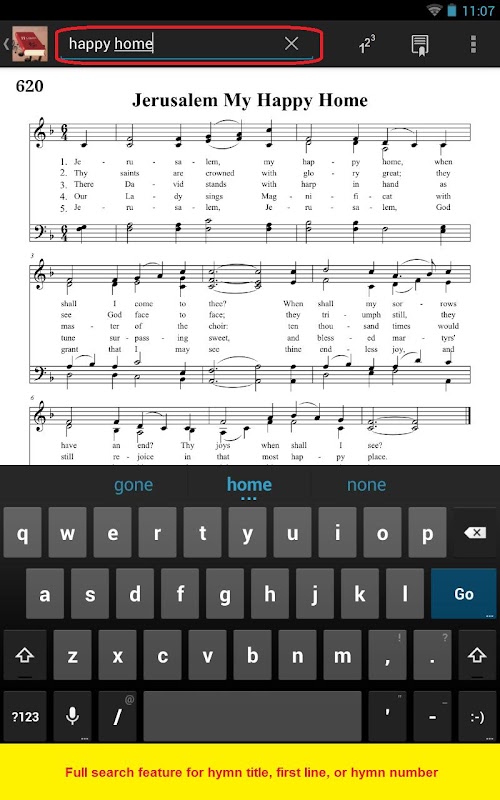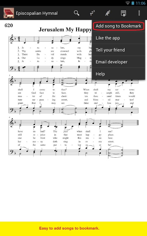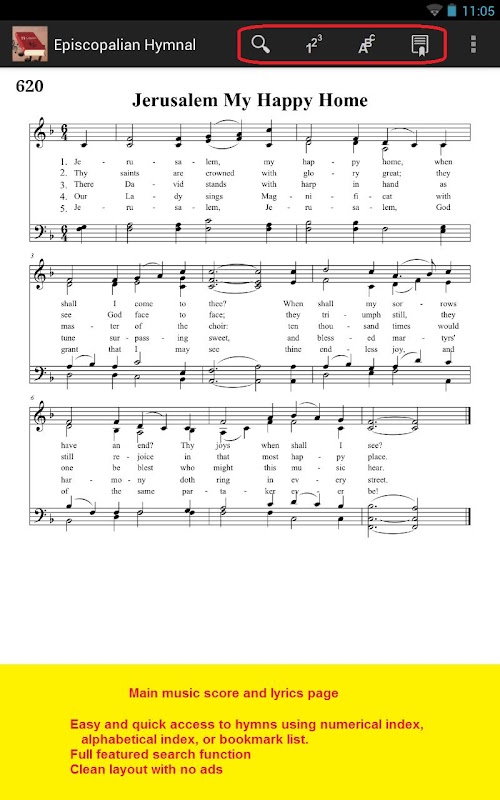 How wonderful and convenient to have your hymnal on your tablet. This is a full featured Episcopalian eHymnal with professionally typeset 4-part harmony music scores and lyrics.
