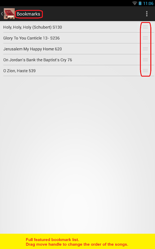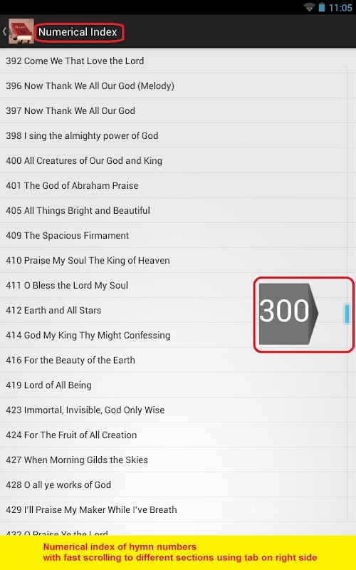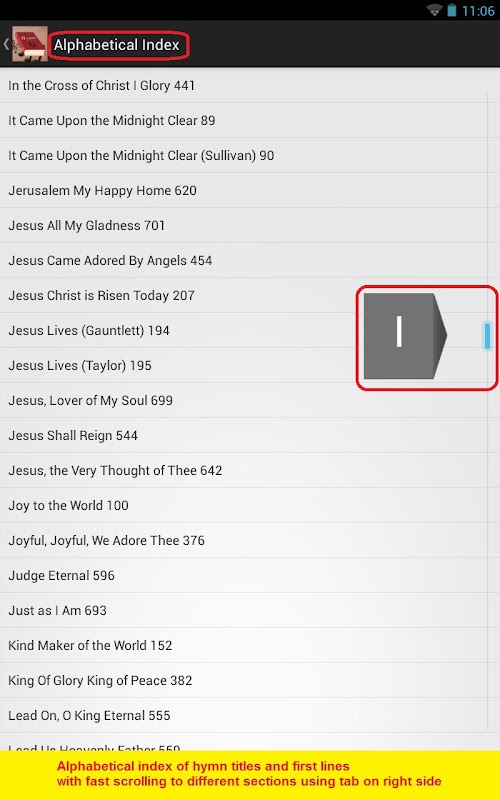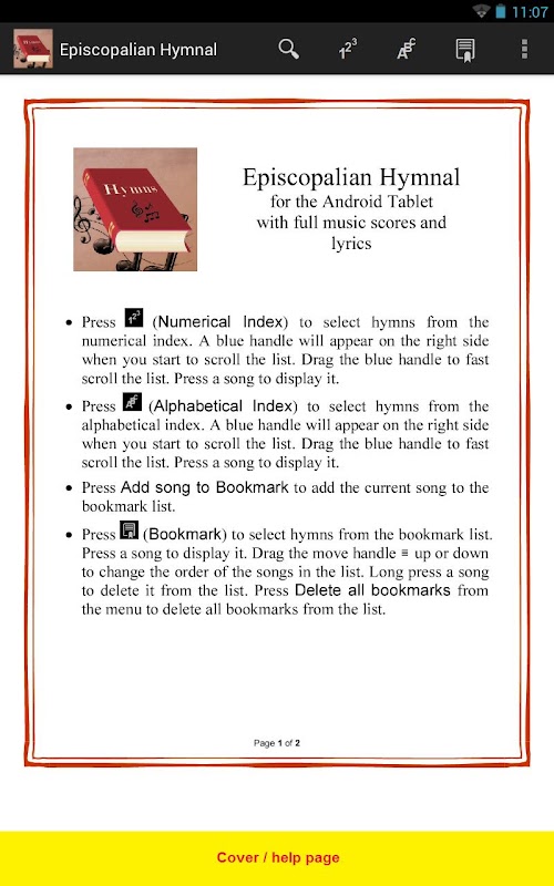 The user interface has a clean look with no ads, and very easy to use. You can quickly and easily find the hymn that you want either by selecting from the alphabetical index of hymn titles, the numerical index of hymn numbers based on the Episcopal Hymnal®, or your own bookmark list. There is a full featured bookmark list for you to add songs that you need for quick access. Use the search feature to quickly search for words in the title, or just enter a hymn number to jump directly to that hymn. You can also swipe left or right to go to the next or previous song just like turning pages in the printed hymnal. The swipe turning sequence can either be in numerical hymn number order, alphabetical hymn title order, or bookmark list order. Zoom in for larger notes and texts both in portrait or landscape orientations.