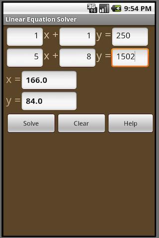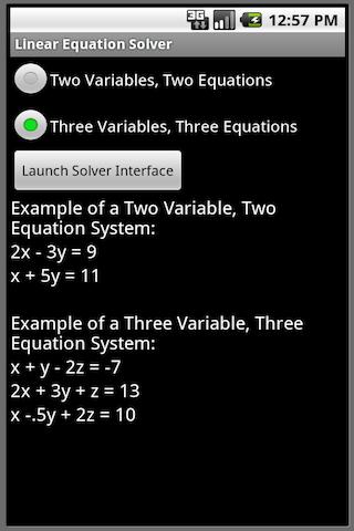 This application will solve a system of linear equations with either three variables or two variables. For example, let's say you have the system of equations: