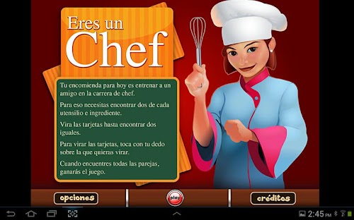 Tu encomienda para hoy es entrenar a un amigo en la carrera de chef. Para eso necesitas encontrar dos de cada utensilio e ingrediente. Vira las tarjetas hasta encontrar dos iguales. Para virar las tarjetas, toca con tu dedo sobre la que quieras virar. Cuando encuentres todas las parejas, ganarás el juego.Your train today is entrusted to a friend in chef's career. For that you need to find two of each utensil and ingredient. Vira cards to find two alike. To turn the cards, tap with your finger on the one you want to turn. When you find all the pairs, you win the game.