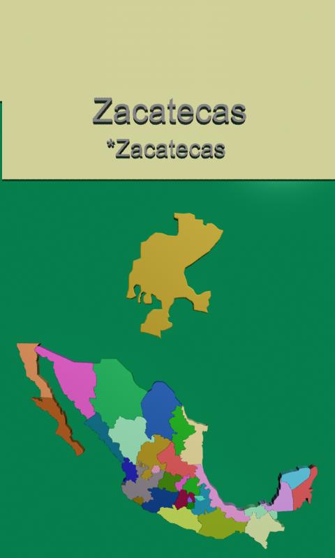 Con esta aplicacion podras aprender donde se encuentran todos los estado de Mexico y cuales son las capitales, esto sin la necesidad de internet, puedes utilizar el boton desplegable para seleccionar el estado que deses o puedes tocar la pantalla de derecha a izquierda para avanzar de un estado a otro, al tocar la pantalla podras hacer un acercamiento para ver donde se encuentra el estadoWith this application you can learn where all the states of Mexico and what are the capitals, this without the need of internet, you can use the drop-down button to select the state that deses or you can touch the screen from right to left to advance a state to another, touching the screen you can zoom in to see where the state