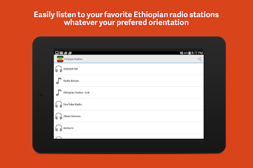 Ethiopian radios app brings a large collection of your favorite radios and FM stations from Ethiopia streaming live on your android devices.Now enjoy listening to the online radio broadcasts and music from Ethiopia live on your android phones and tablet devices with just tap of a button, no matter where you are.