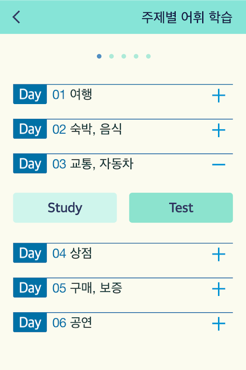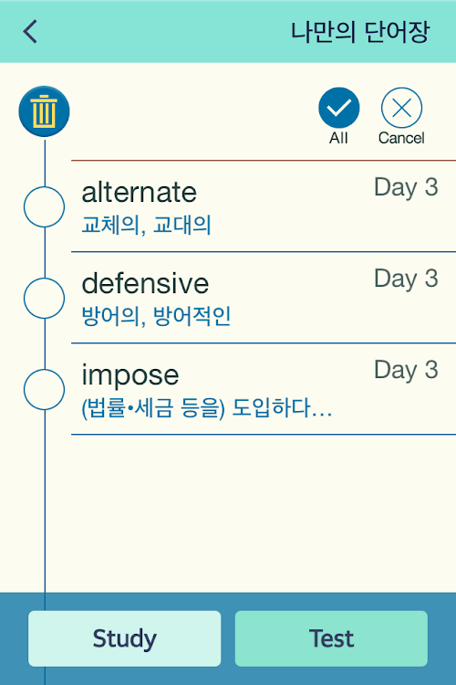 주제별 어휘학습에서 원하는 단어를 선택하여 저장해 놓으면 나만의 단어장에서 언제든지 복습 및 테스트를 할 수 있습니다.