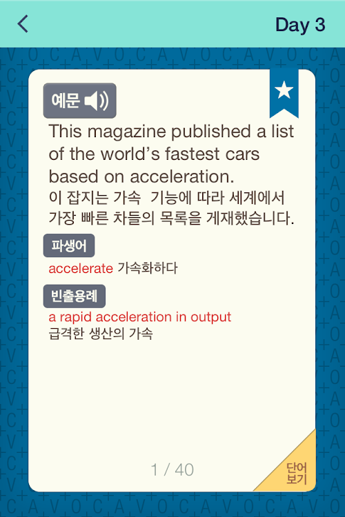 아는 단어는 카드를 위로 올리고, 모르는 단어는 카드를 아래로 내려주세요. 한 Day의 학습이 끝나면 모르는 단어만 모아서 다시 학습할 수 있습니다.