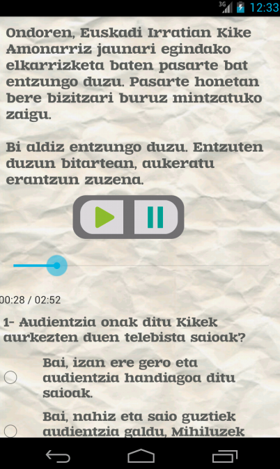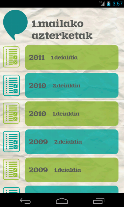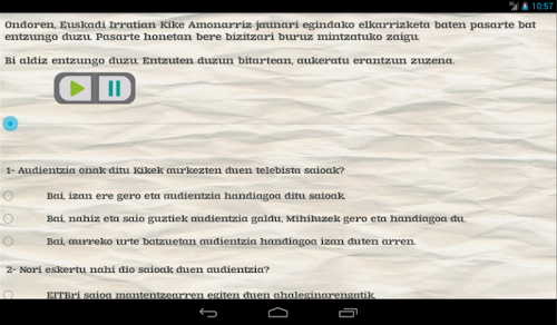 Are you learning Basque? Are you trying to pass exams HABE? Now you can prepare easier than ever considering the first level with this app. Anywhere, at the time you choose will have to hand directly on your smartphone or on your tablet official past papers. You can make and correct at the time a lot of exercises.